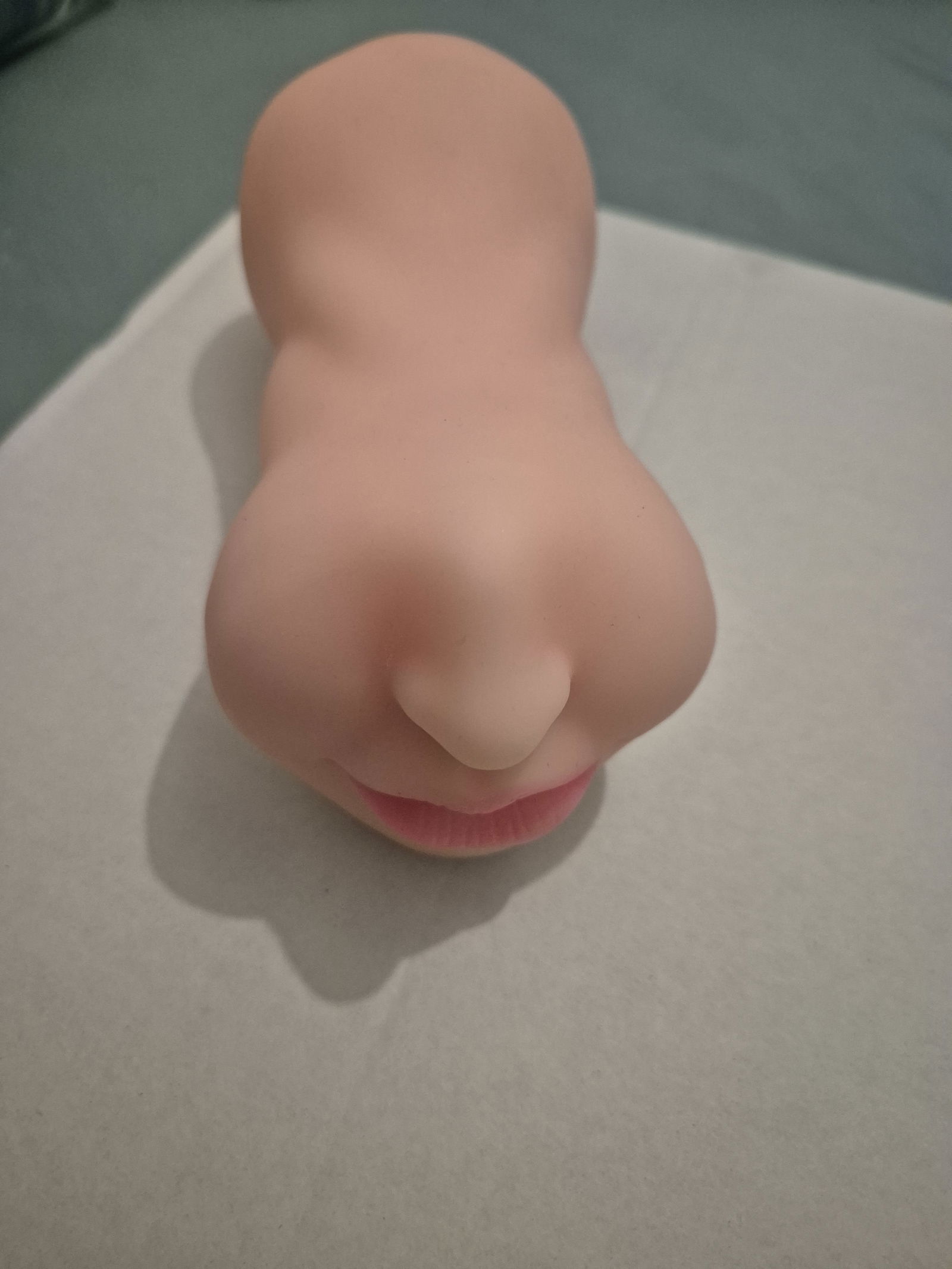 Das Onahole kam mit blaugrünen Abreibpartikeln vom Herstellungsprozess AUF und IN dem toy verteilt, die sich auch nur nach und nach entfernen lassen. Tropfen von Gleitmittel die man oben reingibt haben einen geraden Weg bis nach unten durch, was natürlich eine ziemliche Sauerei verursachen kann wenn man nicht aufpasst. Der Mund selbst ist so klein dass selbst wenn ich nur meinen Daumen reinstecke, sich das ganze Gesicht nach innen stülpt und selbst verspeist.